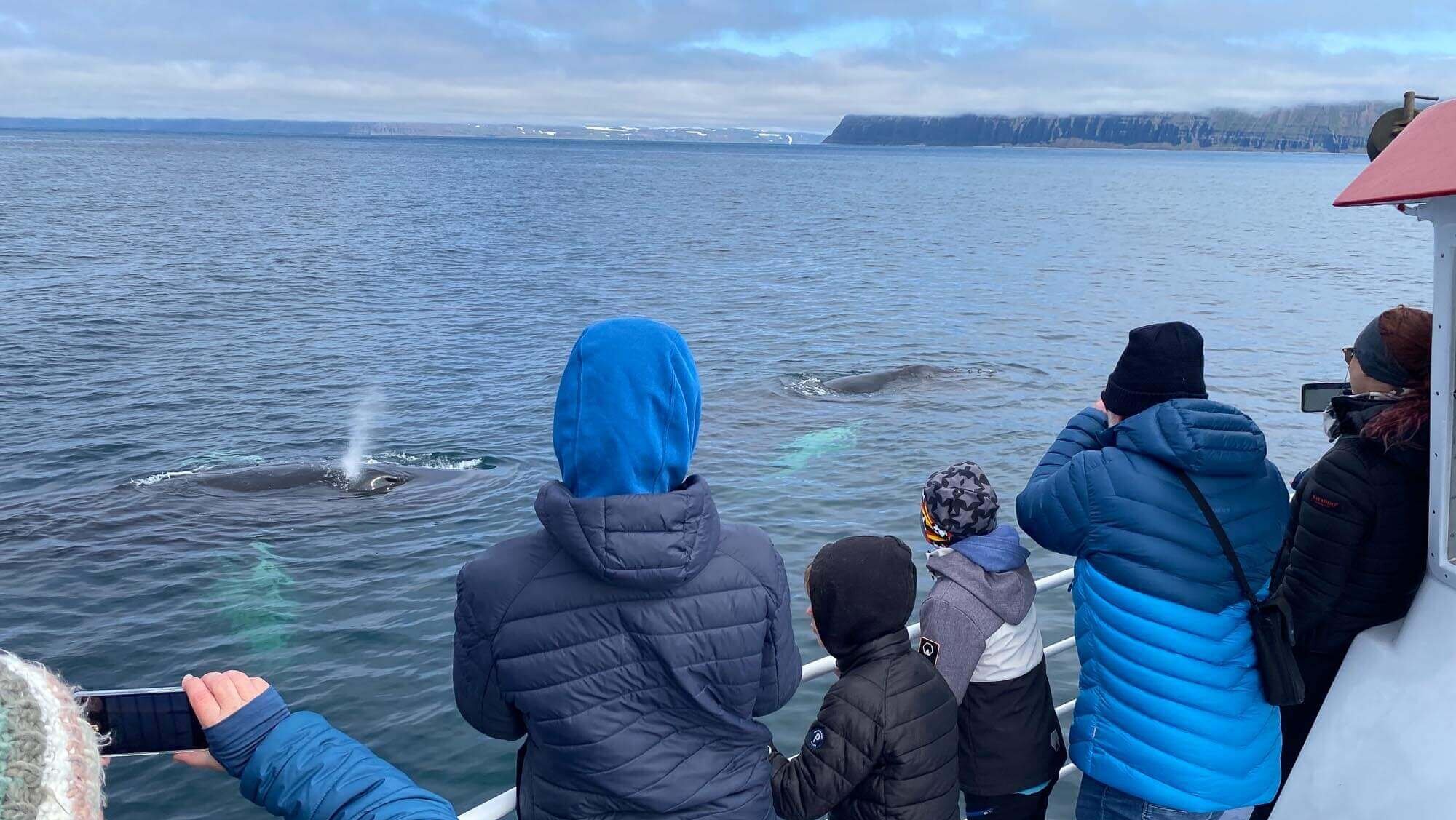 Warm outdoor clothing. While our boats, Sif and Íris, are fully equipped with warm interiors, the best spot for whale watching is outside. We recommend wearing layers to stay warm!